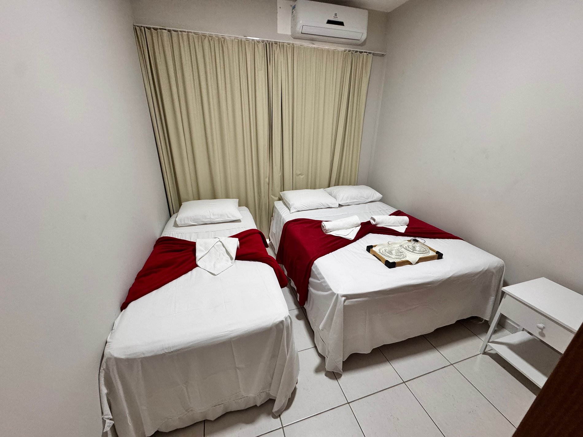03 quartos (Sendo 01 suíte master com cama queen, 01 quarto com 01 cama de casal + 01 cama de solteiro e 01 quarto com 02 camas de solteiro e 01 cama extra)