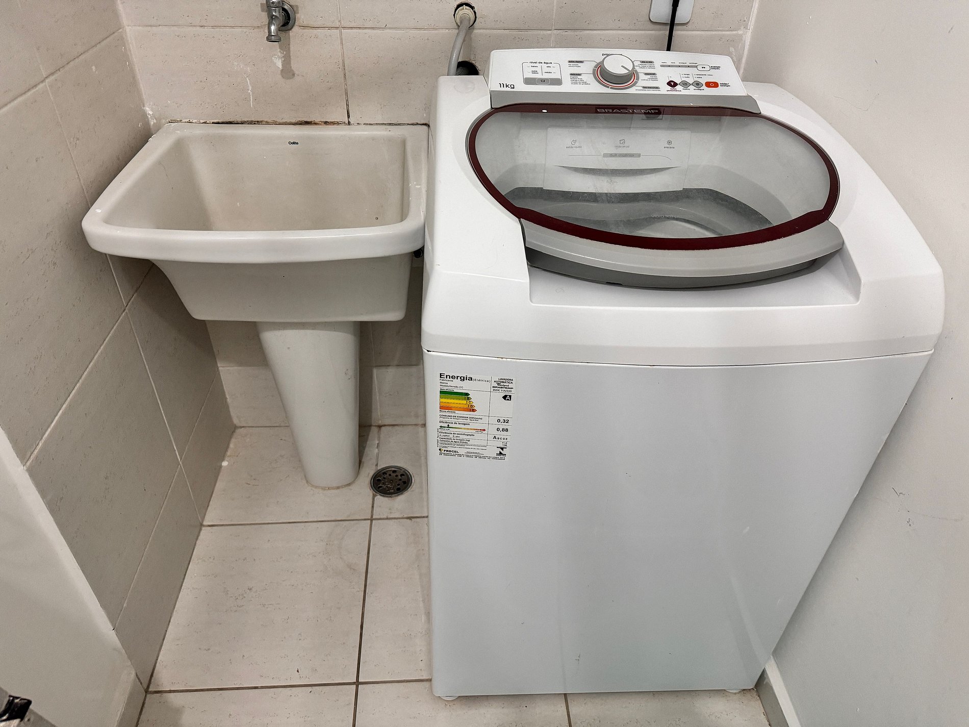 Lavanderia com maquina de lavar e banheiro